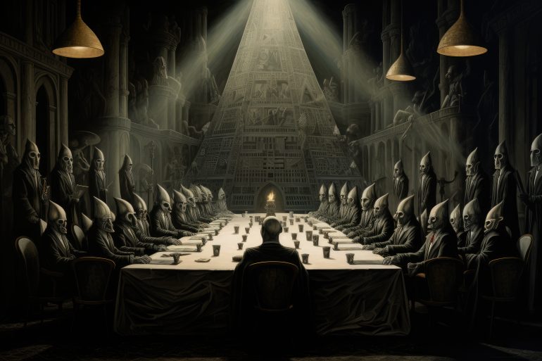 Fantasy image of a group of people sitting in front of the church, A secret society meeting plotting a conspiracy, AI Generated