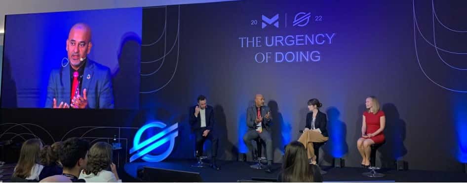 Shashank Rai, Chief Technology Officer at the UN’s UNICC speaks at a panel called “Meeting Humanitarian Need through Digital Tools” along with Denelle Dixon CEO of the Stellar Development Foundation and Carmen Hett, Treasurer at UNHCR, at the 2022 Stellar Meridian Blockchain Conference, Source: UNICC