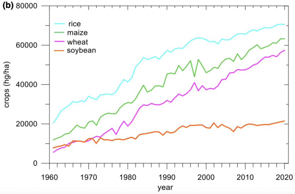 The above graph shows the enormous rises in Chinese yields for staples such as rice, maize and wheat measured by hectogram per hectare. The researchers note that improved agricultural management has had a part to play, although yields started to rise even during the instabilities of the immediate post-Mao period. The scientists also note that there is no obvious increasing trend in precipitation, while China’s air temperature and the global CO2 rise “have the same trend as crop yield”. Recent lower levels of Arctic sea ice are considered an ”indirect process”, but the conclusions of the paper are clear. Warming extends the growing season and reduces damage from the cold. Increasing CO2 improves the photosynthetic rate of crops, improves growth rates and dry matter content, and thus improves food production.